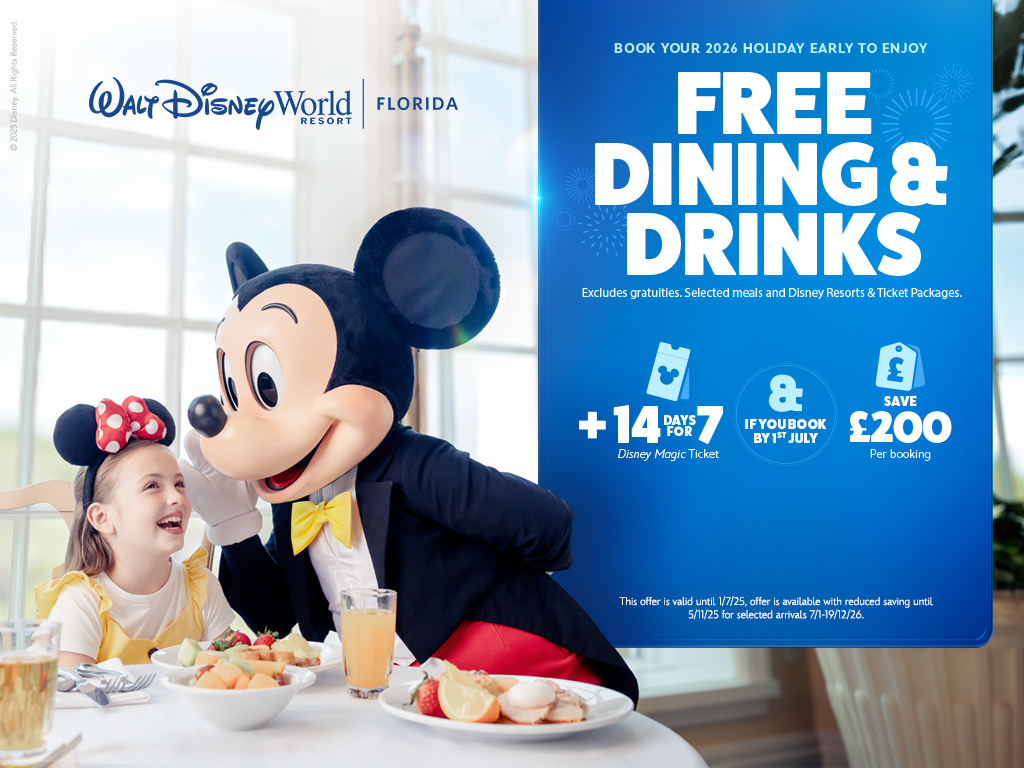 This offer is available on selected arrivals between 7th January and 19th December 2026. ALL guests on the booking will enjoy FREE Disney Dining & Drinks on selected meals when staying at selected Disney Resort hotels.