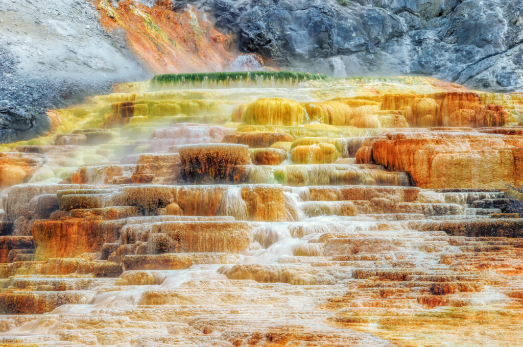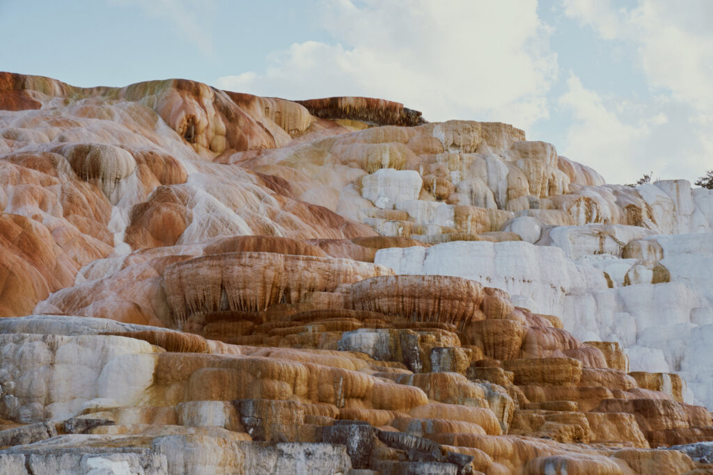 Travertine Terraces are found at Mammoth Hot Springs, where the interactions of water and limestone create chalk-while travertine. These terraces are among the fastest-changing features in the park, emerging quickly and drying up just as fast.
