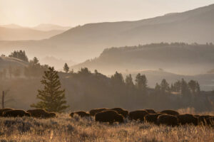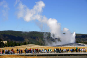 At the heart of Yellowstone’s past, present, and future lies a SUPERVOLCANO. Huge volcanic eruptions occurred here, the latest about 631,000 years ago. The centre of what is now the park collapsed, forming a 30 by 45-mile caldera, or basin. The heat powering those eruptions still fuels the parks’ geysers, hot springs, fumarole, and mud pots. The park’s ecosystems range from near-desert vegetation at the North Entrance to subalpine meadow and forest on Mount Washburn. They support a variety of habitats that sustain diverse wildlife like bison, elk, grizzly and black bears, wolves trumpeter swan, and Yellowstone cutthroat trout.