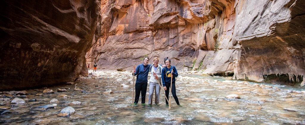 When conditions are favourable, you may decide to walk beyond the end of the trail towards The Narrows, wading upstream in the Virgin River itself. Before you do, make sure to visit the information centre for the up to date river conditions.