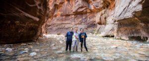 Continuing deeper into the canyon is Weeping Rock, a grotto carved from stone and lavishly adorned with hanging gardens. Here you will find the towering Observation Point, from this lofty perch, you can see the length of Zion Canyon. The road ends at the Temple of Sinawava. From here, the Riverside Walk takes you deeper into the canyon beyond the end of the road. This is an easy, paved path with nearly 2000 foot high canyon walls towering both sides