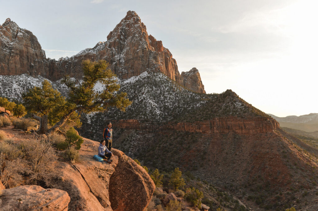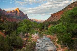 The Watchman, standing guard at the park's south entrance, is a monolith that rises more than 2,400 feet above the river and is highlighted in the evening by the setting sun. West Temple, behind the Zion Human History Museum, is the highest peak in the southern part of Zion. In layer upon layer of rock, it ascends more than 3,800 feet from its base.