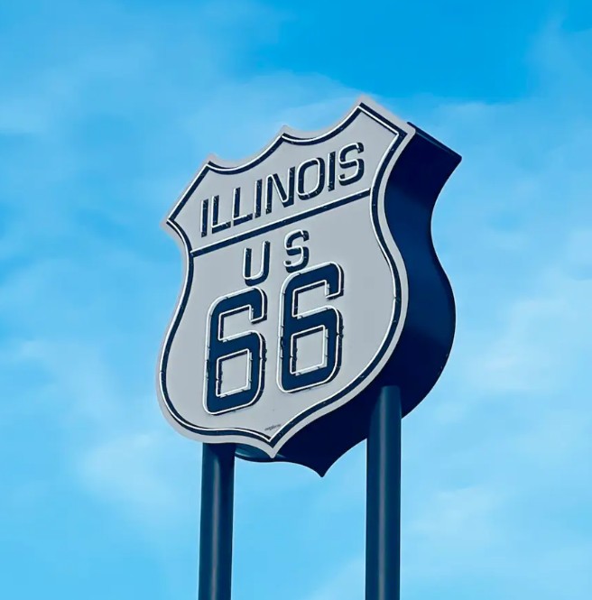 Millennium Park, Navy Pier, and the Art Institute in Chicago; the Old Joliet Prison; the Route 66 Hall of Fame & Museum in Pontiac; Ambler’s Texaco Station in Dwight; the Lincoln Home National Historic Site; the Paul Bunyan Hotdog Statue and the Cozy Dog Drive-In; the Pink Elephant Antique Mall and Sky View Drive-In in Litchfield; and the World’s Largest Catsup Bottle in Collinsville.