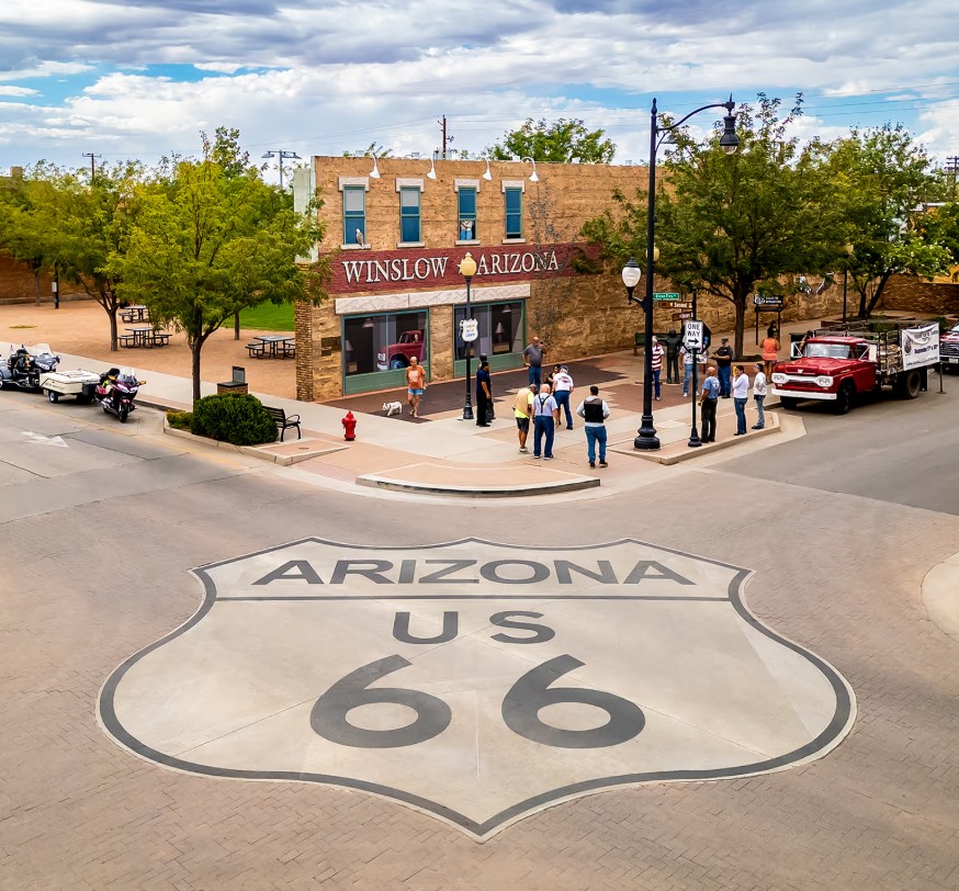 The Wigwam Motel in Holbrook, Petrified Forest National Park, Standin’ on the Corner Park and Meteor Crater in Winslow, the Route 66 Walk This Talk Tour in Flagstaff, Bearizona in Williams, the historic town of Seligman, Grand Canyon Caverns in Peach Springs, and the Route 66 Museum in Kingman.