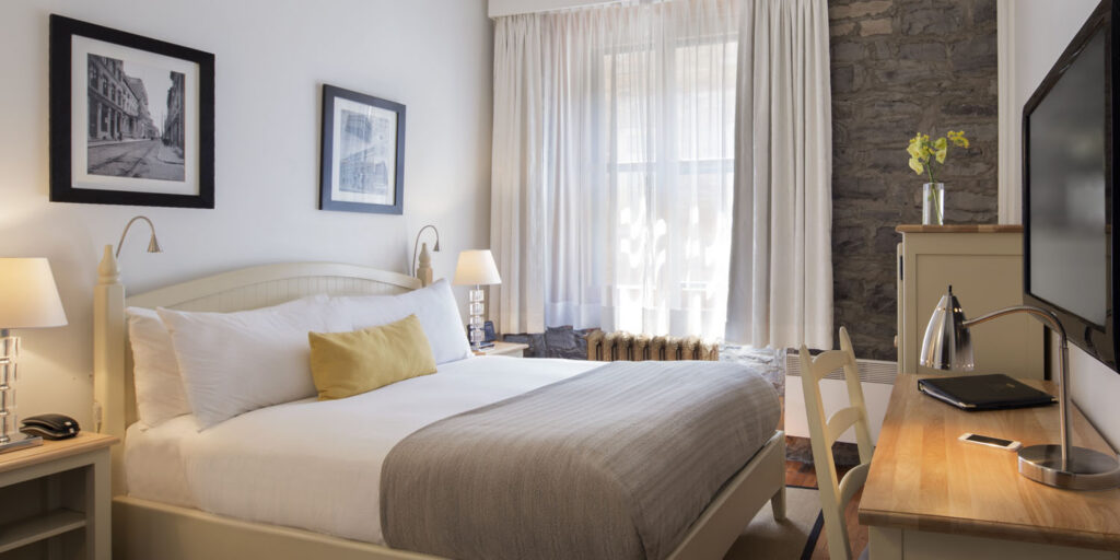 Auberge Le Saint-Pierre’s distinctive façade and warm interiors; enhanced with hardwood floors and stone walls, make it one of the most popular boutique hotels in Quebec City. Each of the 41 guestrooms and suites are unique in design and layout, however all feature a flat screen television, Keurig coffee-maker, wireless internet and pillow-top beds adorned with crisp linens and down comforters. For additional space and amenities, choose one of the Junior or Loft-style suites.