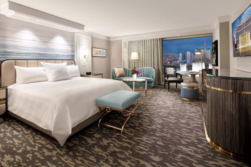 Vegas Strip View Room Take in breath-taking views of the glittering Las Vegas Strip through floor-to-ceiling windows in the Strip View Rooms, located on the 9th to 22nd floors. When the sun sets, The Strip comes alive with miles of its world-famous neon lights visible. These 500 sq ft rooms offer a chic, contemporary décor with either a king or two double beds, a valet closet and a walk-in wardrobe. Encased in glass, bathrooms feel like private spas with large baths, showers and plenty of natural light.