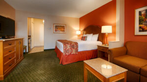 The guestrooms and suites at the Best Western Kingsman are elegantly appointed in a classic style, featuring a warm colour palette, dark carpets, and wood furnishings. Each room is equipped with complimentary Wi-Fi, a television, a refrigerator, a microwave, and a coffee maker. The accommodations also include marble bathrooms and either a king-sized bed or two queen-sized beds, providing a comfortable and refined stay.
