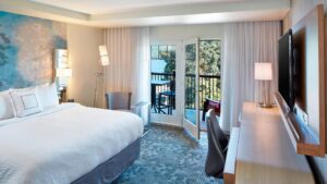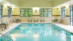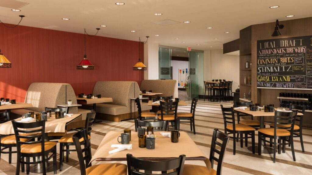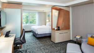 Guestrooms in the Courtyard by Marriott, Lake George are modern in style with wood furnishing throughout. Each room is adorned with a bright colour palette and all the amenities you need for a comfortable stay. Complimentary Wi-Fi, flat-screen televisions, coffeemakers, air-conditioning, mini-refrigerators, and microwaves are included in every room. Suites are also available offering additional space and upgraded amenities.