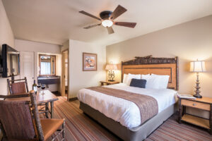 The 663 rooms of the Denali Princess Wilderness Lodge are spread out across the grounds of the expansive property in different buildings. The rooms feature either one king bed or two double beds and sleep a maximum of two to four people. Along with a full private bathroom, the rooms are equipped with a flat-screen television, a coffeemaker, and a hairdryer.