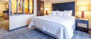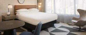 Crisp white, and burnt orange palettes blend to create a modern, yet elegant sanctuary to relax and lay your head. 55″ flat screen televisions, ergonomic chair, WiFi, coffee maker, air conditioning and Doubletree’s signature Sweet Dreams Beds come as standard in all guestrooms, plus there are both one bedroom and two bedroom suites available which are spacious and offer upgraded amenities.