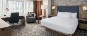 Crisp white and a grey palette blend to create an elegant sanctuary to relax and lay your head. Flat-screen televisions, ergonomic chairs, complimentary Wi-Fi, coffee maker, mini-refrigerator, air conditioning, and Doubletree’s signature Sweet Dreams Beds come as standard in all guestrooms, plus there is a selection of suites available that are spacious and offer upgraded amenities.