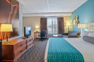 Elevation Inn & Suites offers a selection of 98 well-appointed rooms and suites, each designed to provide comfort and feature a contemporary decor with a blend of warm tones and modern furnishings, creating a welcoming atmosphere. Each room features thoughtful amenities including complimentary Wi-Fi, flat screen televisions, refrigerator, microwave, coffee maker, and safety deposit box. The suites available offer additional living space and upgraded amenities.