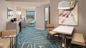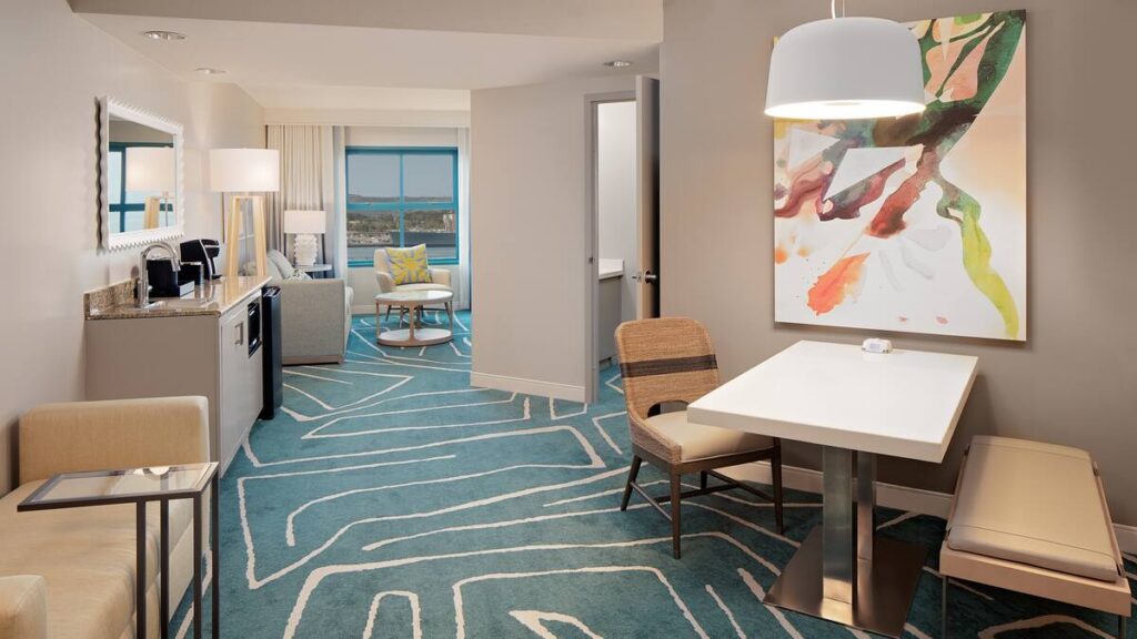 Each suite features a contemporary design accentuated with vibrant colours and modern comforts. Standard amenities in every suite include a king bed or two queen beds with plush bedding, complimentary Wi-Fi, televisions, a coffee maker, a mini-refrigerator, a microwave, and air conditioning. Additionally, two-bedroom suites are available, providing extra living space ideal for larger families.