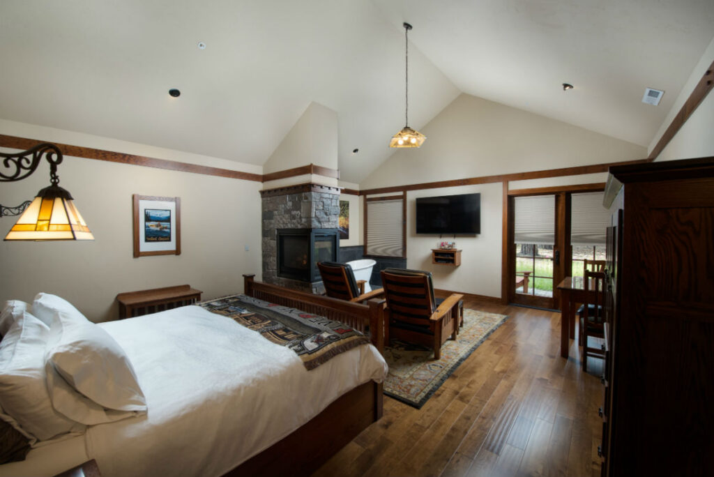 Patio Suite (at the Lodge): This 560 Sq. ft. lodge room sits just steps away from the nightly beer and wine reception, and the lodges DVD, book and game collection, and impressive 26’ natural stone fireplace. The Patio Suite features a king bed, 49” flat screen television, hand-tiled gas fireplace, Italian tiled shower and a Kohler Purist waterfall soaking tub. French doors open onto the lodge back patio complete with two Adirondack chairs and footstools, the perfect setting to enjoy a glass of wine.