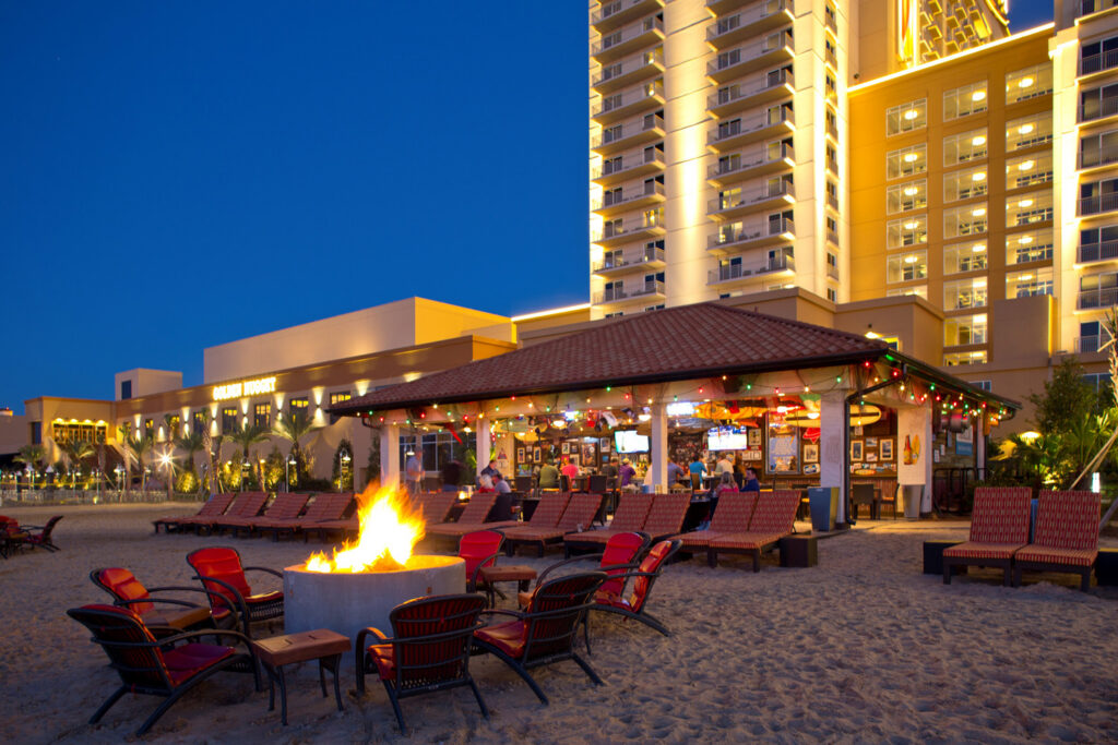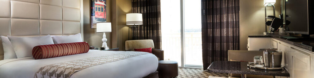 Perched on a picturesque curve of the Lake Charles shore, the Golden Nugget Hotel is a large casino property. Lushly landscaped grounds, a championship golf course, private marina, lakefront beach, and a sprawling two-acre tropic pool paradise with slides and lazy river lend a resort feel to this exhilarating hotel, and all just over three hours from New Orleans.