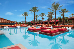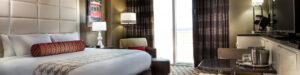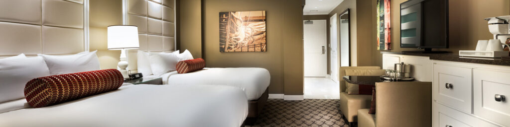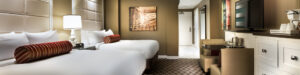 The 1,100 guest rooms and suites feature a perfect blend of modern convenience and contemporary furnishings. Each room is adorned with plush Egyptian-Cotton bedding, floor-to-ceiling windows offering views of either the golf course, lake or pool area, a flat-screen television, coffee maker and Kudos Spa toiletries. A selection of suites are also available offering extra space and added amenities.