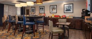 Each of the guestrooms and suites are simple in design with all the modern amenities you need for a comfortable stay. The decor is clean, crisp, and finished with a dark colour palette. Facilities in each room include a flat-screen television, complimentary Wi-Fi, coffee maker, alarm clock radio, and bathroom products. Suites are also available offering additional living space and upgraded amenities including a kitchenette.