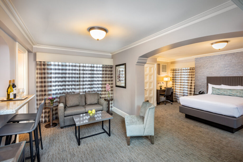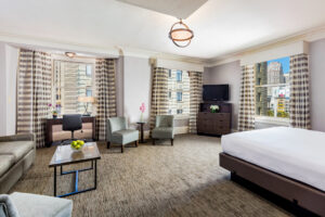 All guestrooms and suites at the Handlery are tastefully furnished. The historic section houses 284 rooms, each features a flat screen television, mini-refrigerator and complimentary wireless internet. Upgrading to the premier section of the hotel offers a more spacious room and a number of additional benefits including complimentary bottled water, bathrobes and slippers and many of these accommodations feature balconies affording views of either the outdoor pool or the city.