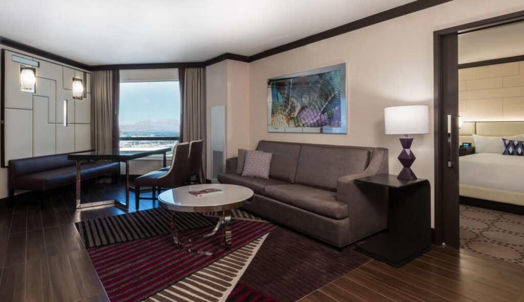 Panorama Strip View One Bedroom Suite Offering Strip views, the layout of these one-bed suites takes advantage of the building’s architecture, creating interesting spaces for the bedroom, sitting room and bar. The bathroom features a walk-in shower and bath. They offer a king bed and are 765 sq ft.