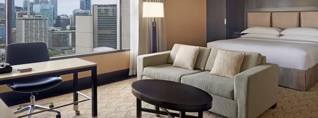 The Hilton Toronto boasts a prime location in the vibrant heart of downtown, providing guests with unparalleled access to some of the city’s most iconic attractions. Situated adjacent to the CN Tower, Rogers Centre, and the Toronto Eaton Centre, the hotel ensures convenience and ease of exploration. Furthermore, a diverse array of shopping outlets, dining establishments, and vibrant nightlife options are just steps away from the hotel. Toronto Pearson International Airport is conveniently less than a one hours drive from the property.