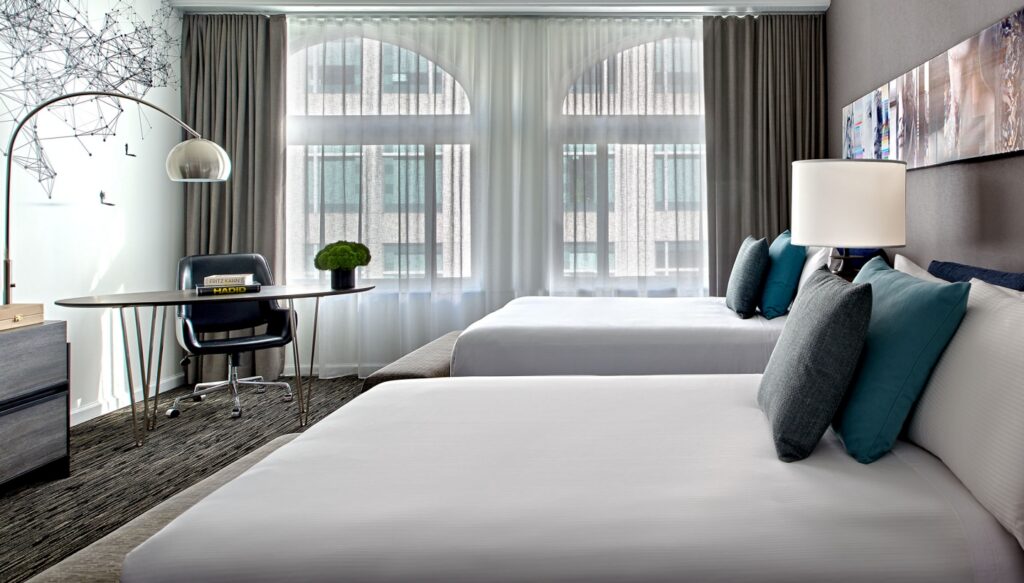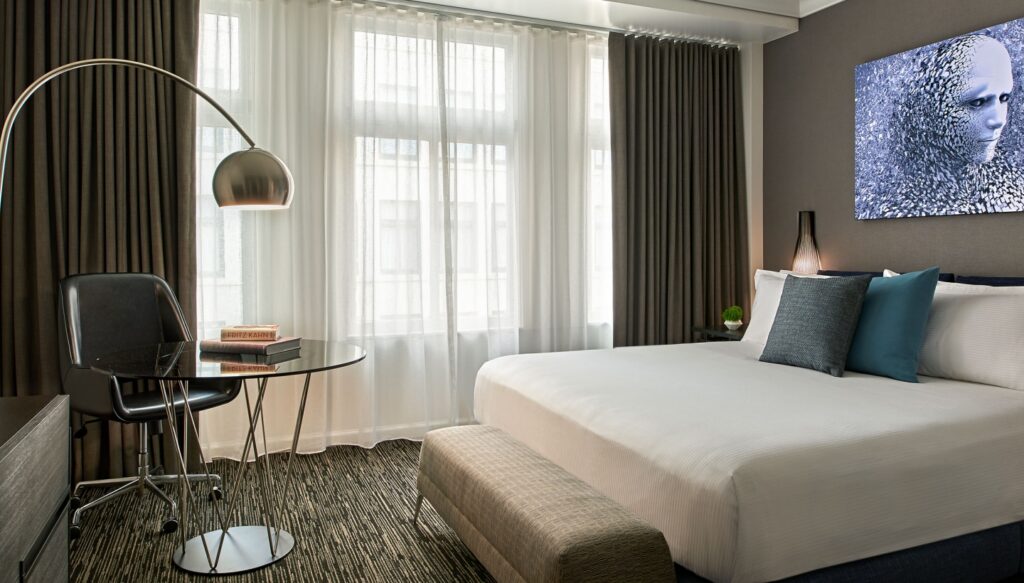 A contemporary urban boutique hotel, Hotel Zelos brings a modern vibrancy to 4th Street. Guestrooms are spacious and utilise understated textural elements, such as emerald toned fabrics, fine woods, raffia wall coverings and alligator-print carpets. 27″ televisions, luxury hair care and body products, warm terry robes and mini-bars are standard in all rooms and suites.