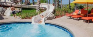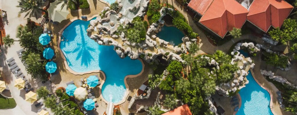 • Half-acre outdoor pool complex with 12 waterfalls, two hot tubs, a waterslide and water-jet splash zone