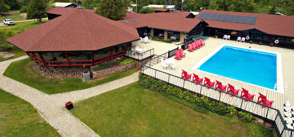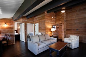 Pine Lodge Rooms – Part of the heritage section of the lodge, the Pine lodge rooms are aptly named, rustic and charming featuring panelled walls. Each room features big beautiful windows, a small three-piece bathroom with a shower, air conditioning, and a plush Queen and Twin bed.
