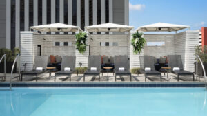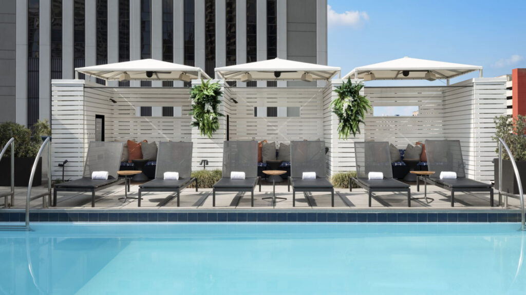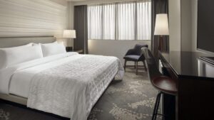 Each of the 410 guest rooms features calming neutral tones with subtle accents, plush pillows, and a king bed or two queen beds with pillow-top mattresses and 250-thread-count sheets. Amenities in every room include a flat-screen TV, mini-refrigerator, wireless internet, air conditioning, an in-room safe, and a luxurious glass-enclosed bathroom. For an elevated experience, Urban guestrooms provide upgraded amenities and a complimentary glass of sparkling wine upon arrival. For those looking for a little bit of extra space, several beautiful suites are also available.