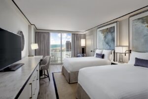 Art Deco style meets 21st century technology in the guestrooms and suites at Loews Miami Beach. An assortment of modern décor furnishes the rooms, but all feature luxury cotton bed linens, luxury toiletries and coffee-maker in addition to flat screen televisions. Views can be either of the city or the bay and many rooms have balconies.