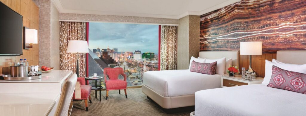 Vegas Strip View Room Take in breath-taking views of the glittering Las Vegas Strip through floor-to-ceiling windows in the Strip View Rooms, located on the 9th to 22nd floors. When the sun sets, The Strip comes alive with miles of its world-famous neon lights visible. These 500 sq ft rooms offer a chic, contemporary décor with either a king or two double beds, a valet closet and a walk-in wardrobe. Encased in glass, bathrooms feel like private spas with large baths, showers and plenty of natural light.