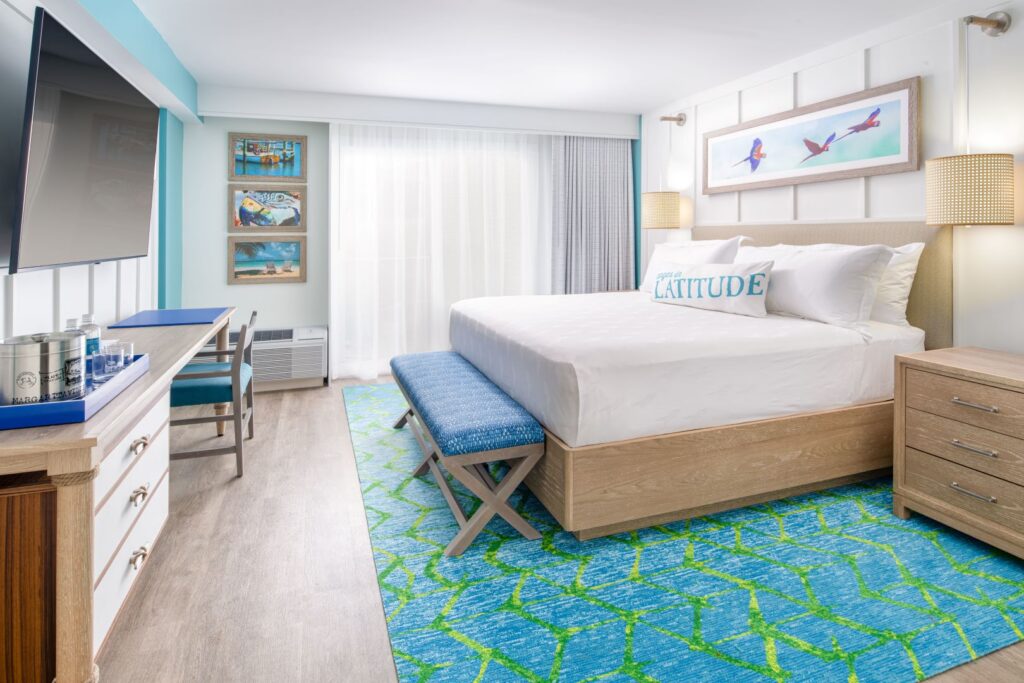 Margaritaville Resort Cape Cod offers a wide selection of accommodations, blending tropical flair with classic New England charm. Guests can choose from comfortable rooms with one king or two queen beds, many available with balconies or water park views. Across all options, interiors feature island-inspired décor in calming coastal tones, premium bedding, spa-style bathrooms, and modern amenities such as flat-screen TVs, Wi-Fi, and other in-room conveniences.