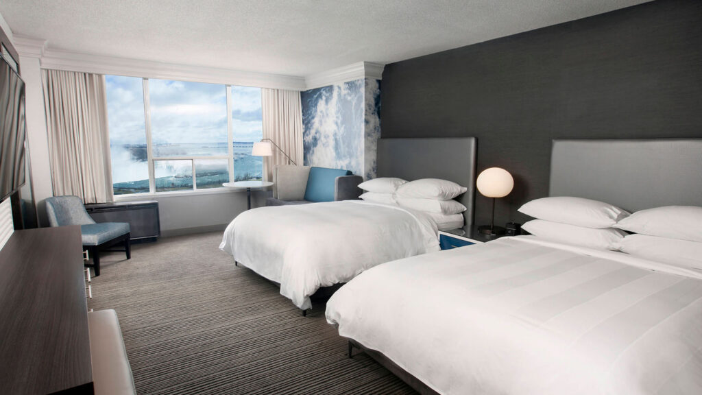 Luxurious Marriott bedding with feather pillows and cotton-rich linens adorn each of the 405 spacious guestrooms, in addition to flat screen televisions, coffee-makers and climate control. The Falls View rooms offer unrivalled and unobstructed views of the Falls. A range of suites provide additional amenities, such as a fireplace or whirlpool bath.