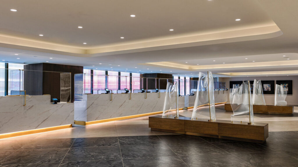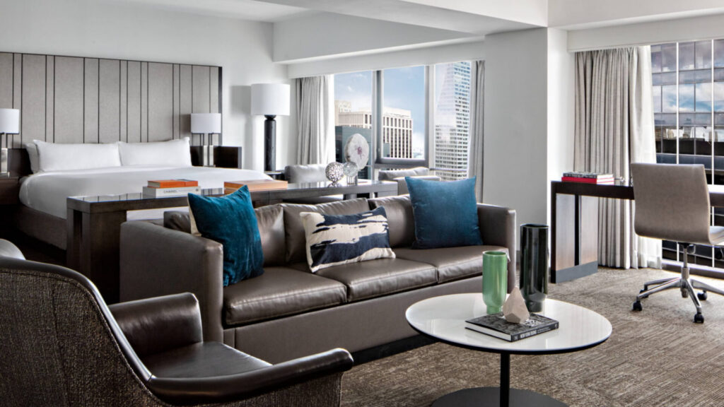 Each of the 1,957 guestrooms at the Marriott Marquis provides a tranquil retreat from the lively atmosphere of Times Square, featuring stylish designs, neutral tones, and stunning views of Times Square and the Manhattan skyline. Room amenities include floor-to-ceiling windows, complimentary Wi-Fi, flat-screen televisions, tea/coffee makers, mini-refrigerators, safety deposit boxes, and air conditioning. Additionally, a wide selection of suites are available, offering extra living space and enhanced amenities.