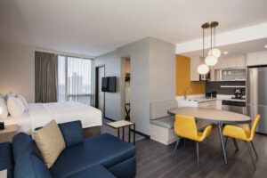 The Residence Inn by Marriott offers an array of spacious and modern studios and suites. No matter which room you choose, you will be greeted with bright decor, floor-to-ceiling windows and all the modern amenities you need for a comfortable stay. Fully-equipped kitchenettes, complimentary Wi-Fi, flat-screen televisions, a coffee maker and a safety deposit box come as standard in all room options. Should you choose a suite, you will receive additional living space, panoramic views of the city and upgraded amenities.