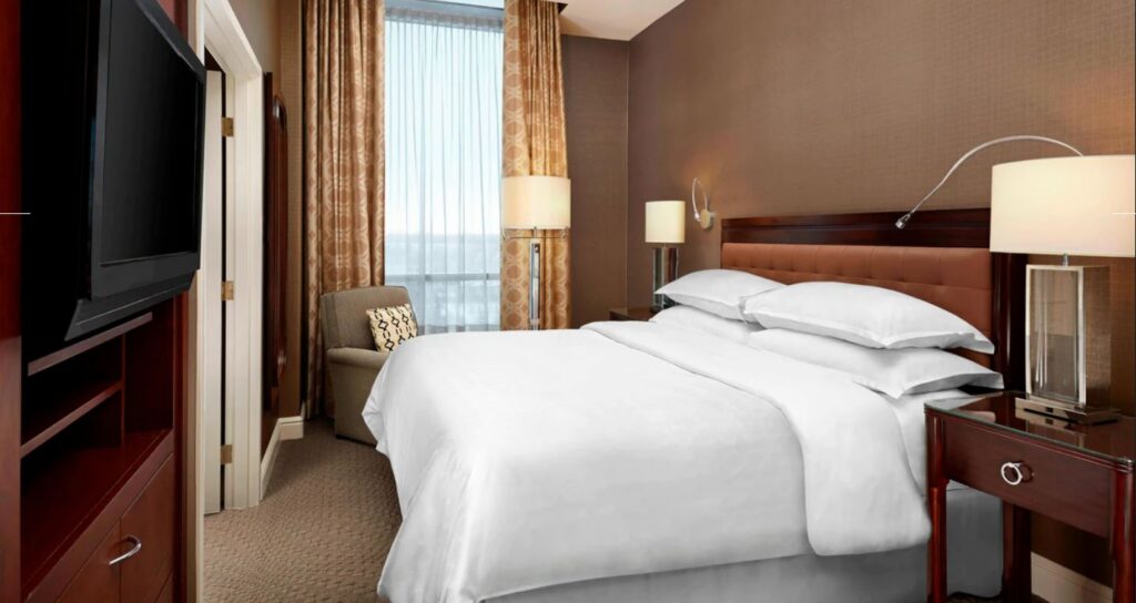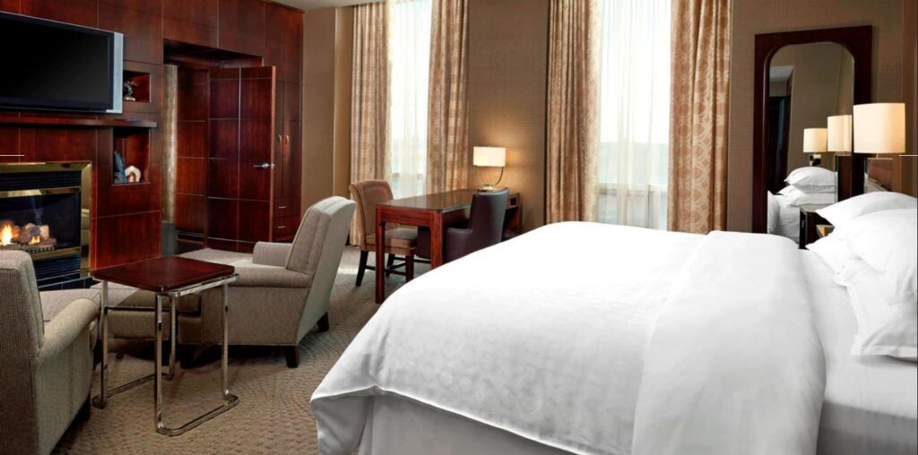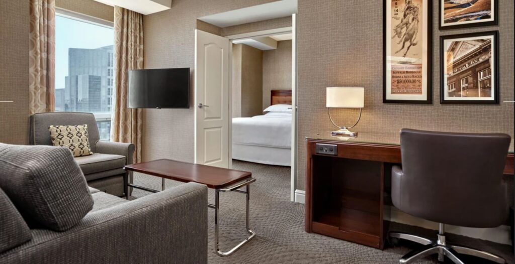 The Sheraton Suites Calgary Eau Claire is situated in the north of downtown Calgary, just one block from the shores of Bow River and the adjacent Princes Island and Eau Claire Parks. Other local attractions are close by, it's just a ten minute walk to Stephen Avenue Walk and Calgary Tower. Calgary International Airport is a thirty minute drive.