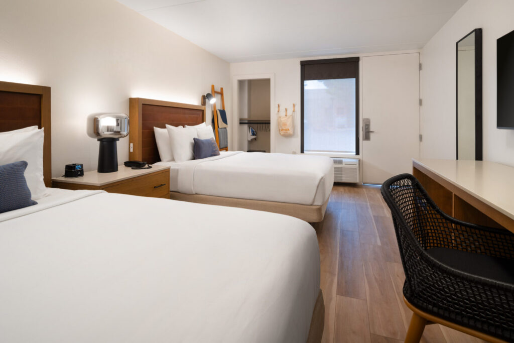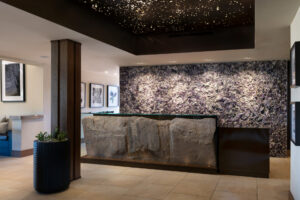 Guestrooms at the Sky Rock Hotel are modern in design with different shades of blue throughout and perfectly finished with wood furnishings for your comfort. Amenities in all rooms include a flat-screen television, complimentary Wi-Fi, a Keurig coffee maker, a mini-refrigerator, and marble bathrooms with thoughtful bath products.