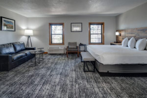 Lodge rooms are housed within the main stone-and-timber building and evoke the warmth and character of a classic mountain retreat. Interiors feature natural wood finishes, earth-toned fabrics, and large windows that frame scenic views of the surrounding forest or granite rock formations. The decor is inspired by the local landscape, blending understated elegance with lodge-style details such as log furnishings, pine accents, and nature-themed artwork. Each lodge room is well-equipped with complimentary Wi-Fi, a flat-screen television, a coffee maker, a mini refrigerator, and plush bedding with soft linens and warm duvets for a cosy, restful night.
