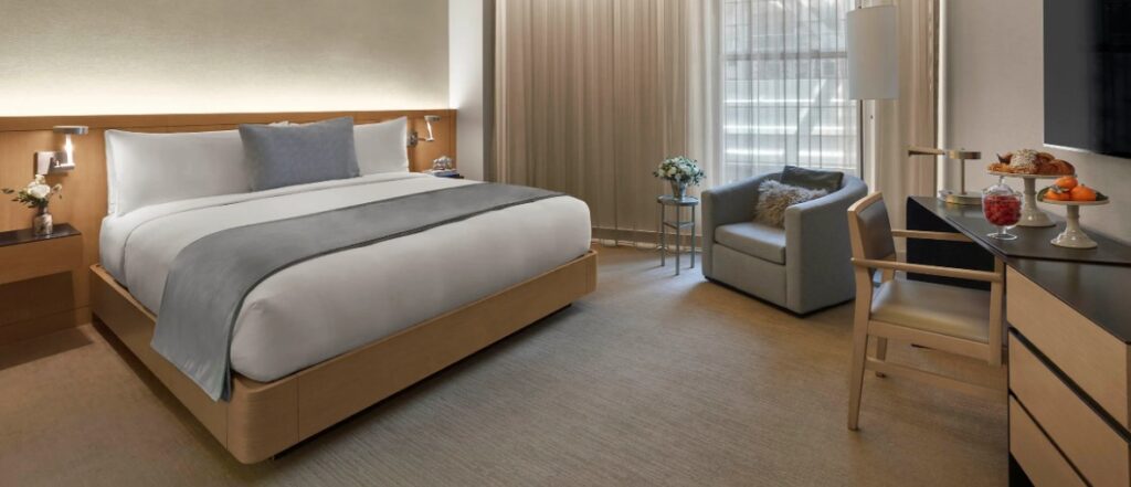Following a full refurbishment, The Knickerbocker reopened as a luxury hotel in 2014, introducing an air of sophisticated elegance to Times Square. The hotel features 330 spacious guestrooms and suites which boast stylish designs and bespoke oak-wood furnishings. Decorated in pristine whites and sleek gold’s, the richly textured fabrics and intelligent lighting add to the sublime ambiance, while plush Stearns & Foster beds piled high with luxurious Sferra linens and Ploh feather pillows invite blissful moments of calm. 55” flat screen televisions, tablet control in-room automation, sound-proof windows, blackout curtains, complimentary soft drink mini bar and WiFi come as standard in all rooms.