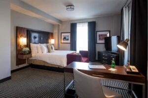 Recently renovated and beautifully styled, The Mayo features 102 luxurious hotel rooms and suites. Bright accent colours and bold patterns pop against neutral backdrops, creating a modern, retro-chic atmosphere. In addition, each accommodation is spacious, bright and thoughtfully appointed with a variety of convenient amenities.