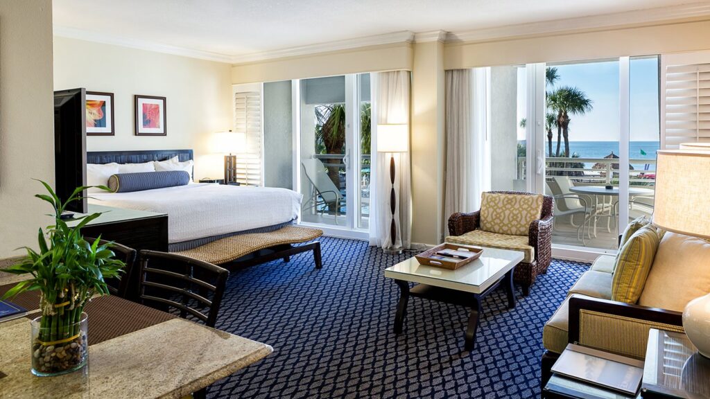 The resort’s creatively designed suites evoke a Balinese feel. Choose from junior suites, one and two bedroom suites or Deluxe two bedroom suites, all with dramatic views of the gulf, lagoon or fairways. Every suite has a large seating area, fully equipped kitchen, spacious balcony, and a flat screen television.