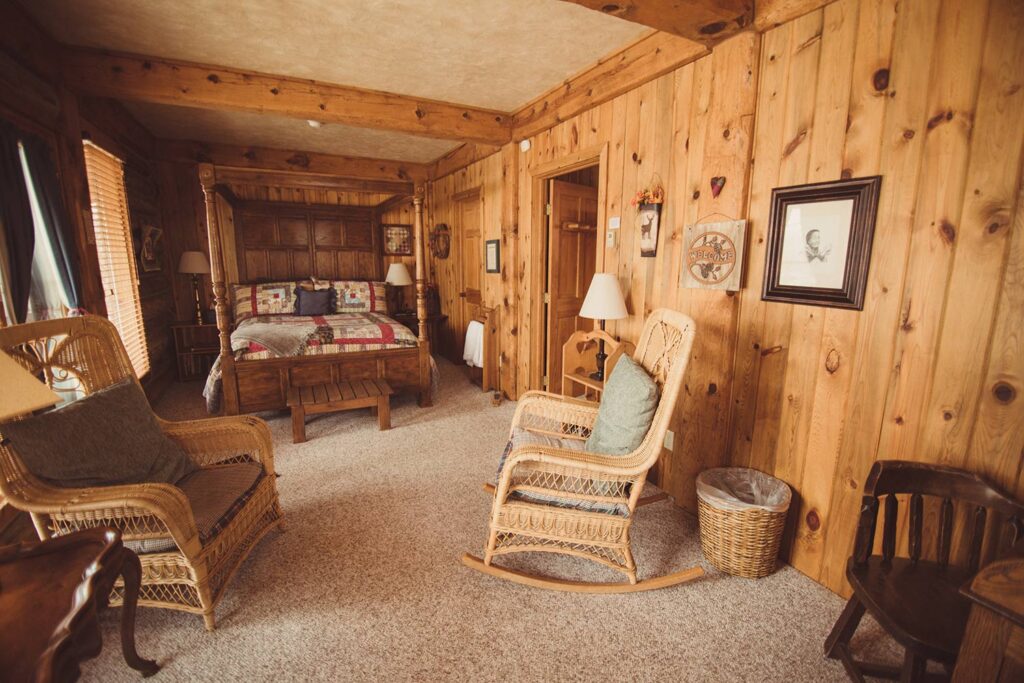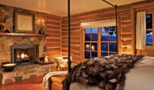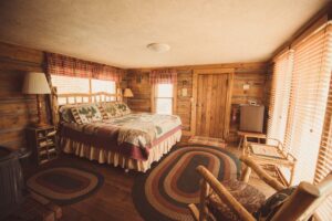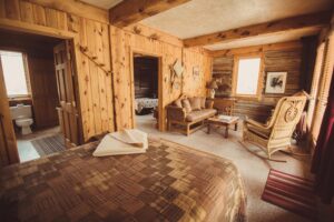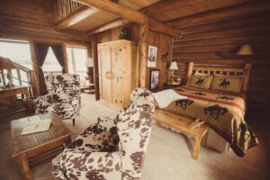 Vee Bar Guest Ranch blends rustic charm with modern convenience across a variety of cabin options and riverside suites. Riverside Suites, located close to the main lodge, sit alongside the riverbank and feature western-themed decor with log and antique furnishings, a gas fireplace, quilt-covered beds, small kitchen facilities including a mini-fridge and coffee maker, washer/dryer, and a private bathroom. Ranch Cabins offer more space and privacy, sleeping five to seven guests, with two to three bedrooms, bathrooms, gas fireplaces, a coffee maker and mini-fridge, and loft or single-level layouts.