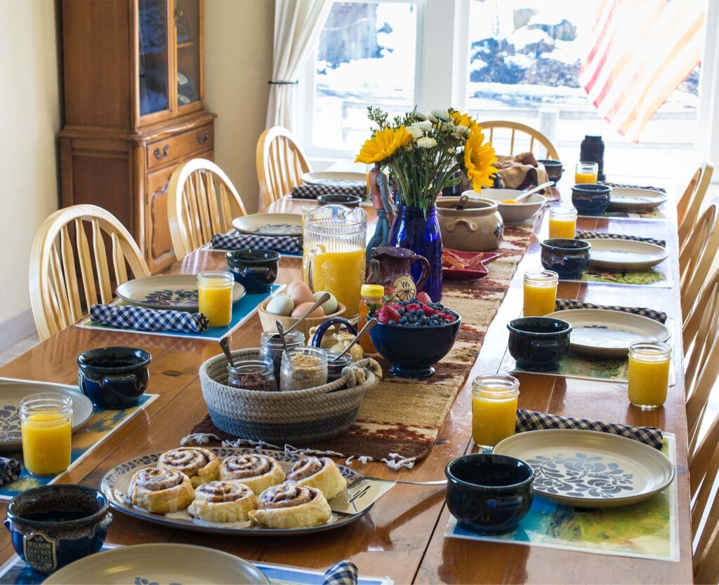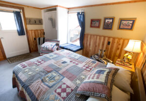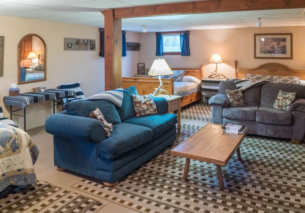 Homestead Room – Larger than most of the cabins this room features a king and two queen beds. Relax on the sofa while warming by the in-room red brick fireplace. Located in the daylight basement with a private entrance leading to the lawn and a sidewalk to the front of the Bed & Breakfast. This room includes complimentary Wi-Fi and a television.