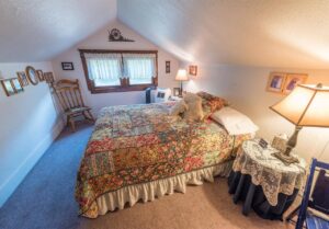 Hideout Suite – This suite combines two rooms that must be booked together and are great for families. Located on the second floor offering captivating views overlooking the deck, alfalfa fields, and rugged Eastern Oregon terrain. It also has a private entrance with a stairway leading to the 400-square-foot deck. The Pioneer room showcases the original 1910 woodwork and captures the charm and nostalgia of the Wilson family heritage. This suite includes complimentary Wi-Fi and a television.