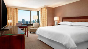 The Sheraton Centre Hotel offers contemporary comforts and a serene escape from the excitement of bustling Toronto. Each guestroom and suite features a modern design, beautifully furnished with light woods and bold colour schemes. All rooms are equipped with numerous amenities, including flat-screen televisions, complimentary WiFi, Sheraton Sweet Sleeper Beds, and large windows showcasing views of downtown Toronto, the CN Tower, Nathan Phillips Square, or the Waterfall Garden. For ultimate indulgence, guests can choose from a wide selection of suites. Club floor rooms include exclusive access to the club lounge, where breakfast and hors d’oeuvres are served.