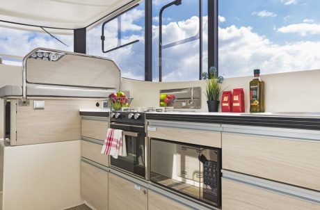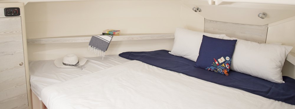 Horizon: Sleeps up to 4 in 2 cabins and 1 bathroom; boat size 11 m × 4 m; 1 large forward cabin with convertible double bed, 1 small cabin for 2 passengers or storage; bathroom with separate shower; large stateroom, backyard outside area, and fully equipped sundeck.